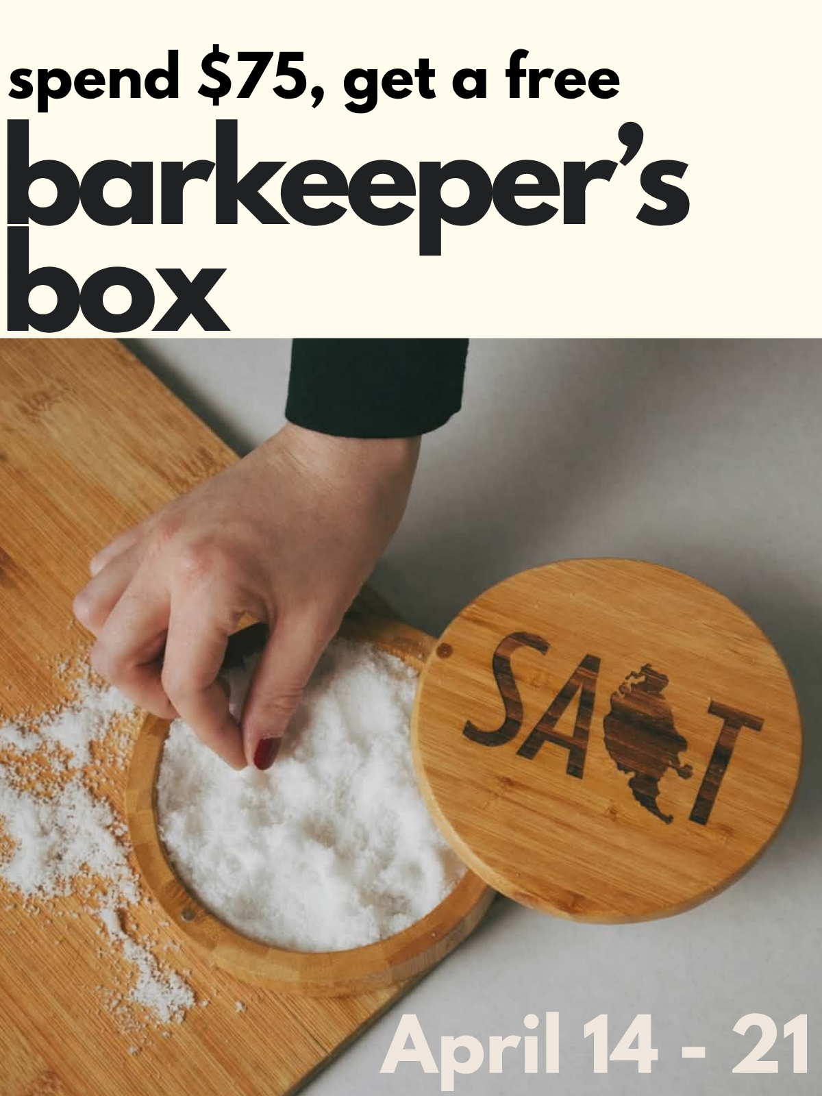 For a limited time, when you spend $75 or more, we’ll throw in our $35 Barkeeper's Saltbox, on us. This sale is online only, April 14th - 21st. No code, and no need to add anything to your cart. Just spend $75 or more, and we'll make sure you get a free barkeeper's box, on us.