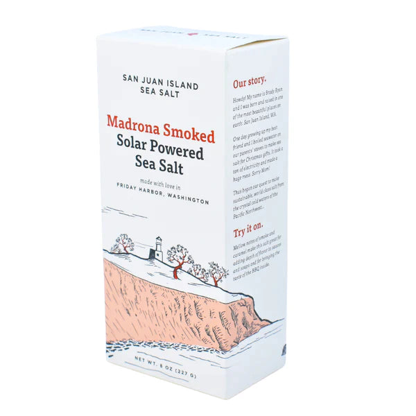 The Pacific Madrona (Arbutus menziesii) is a beautiful native tree that grows along the West coast on rocky slopes and in forest clearings. It's an exceptionally hard wood that is the perfect ingredient for cold smoking our salt over two days. Use this salt for adding depth of flavor to sauces, soups and for bringing the flavor of the BBQ inside.