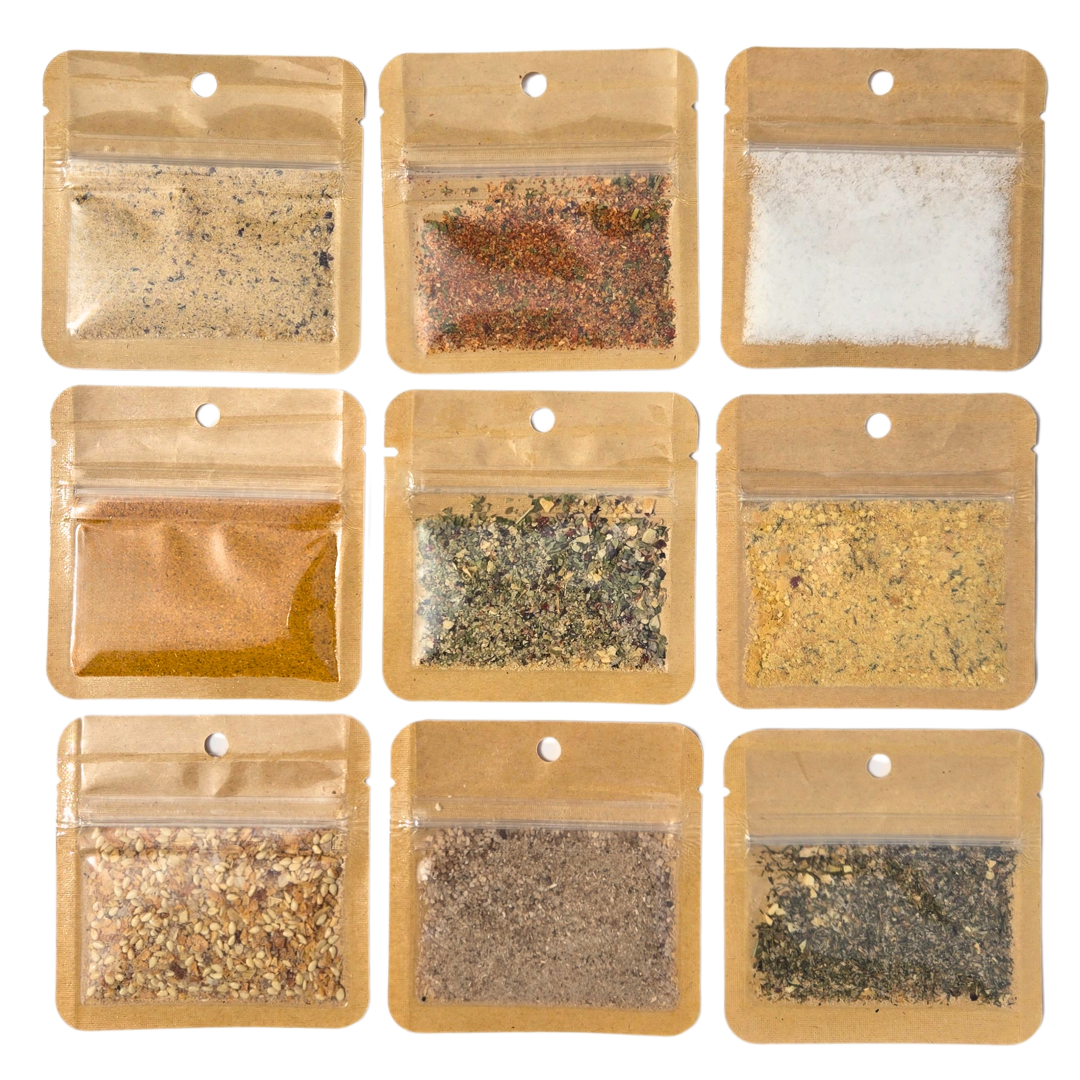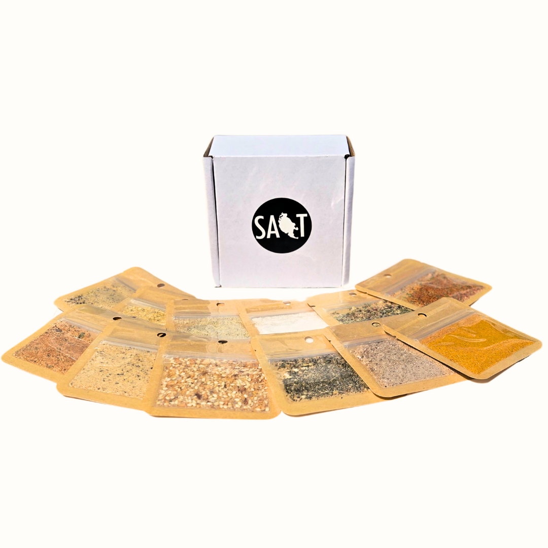 Don't know which blend will be your go-to? Wanna have a little flavor adventure? Get a selection of our faves to try with our sample pack! Each box contains a single-serving of twelve of our salts and seasonings: a mix of bestsellers, our latest releases, and some off-beat fan favorites.
